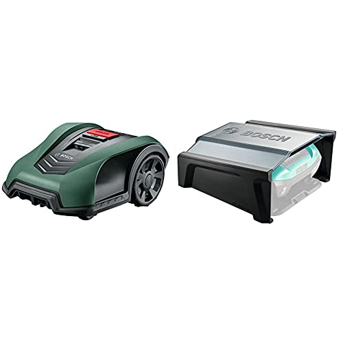 Bosch Mähroboter Indego 350 Connect (mit App-Funktion, 19 cm Schnittbreite, Rasenfläche, bis zu 350 m²) + Garage für Mähroboter Indego 350/400 (Karton, Größe: 275 x 500 x 510 mm)