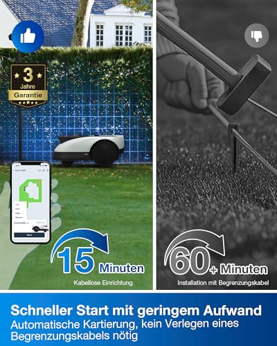 | Einrichtung | Komplett drahtlos; Kartierung via RTK‑Station und App; virtuelle Grenzen/Sperrzonen per Smartphone |