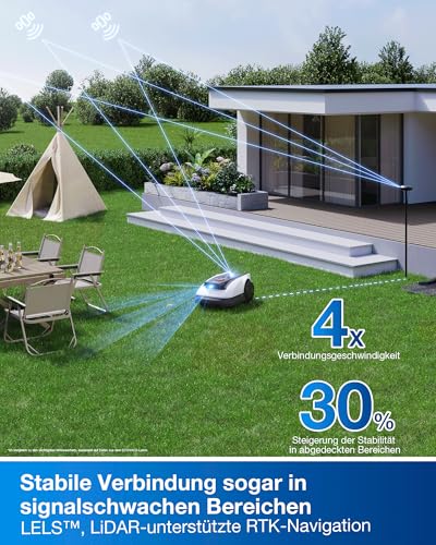 - Präzise Lidar-unterstützte RTK + Vision Navigation: Der Roboter erreicht eine ultra-präzise Positionierung von nur 2cm. Im Vergleich zu anderen RTK-Technologien kann er bis zu 40 Satelliten auf 80% mehr Signalbändern empfangen, bietet eine 4x höhere Verbindungsgeschwindigkeit und eine 30% höhere Stabilität im Schatten von Bäumen oder Gebäuden. In Bereichen mit eingeschränkter Signalqualität sorgt das visuelle Positionierungssystem dafür, dass die Mähpfade kontinuierlich und präzise bleiben, für eine vollständige Rasenpflege.