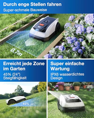 - Navigiert problemlos auf 0,7 Meter breiten Wegen. Bewältigt Steigungen von bis zu 45%: Der GOAT verfügt über ultrakompakte Abmessungen und ist nur 40cm breit, somit passt er mühelos durch Wege mit einer Breite von nur 70cm, ohne steckenzubleiben. Er bewältigt zudem Steigungen bis zu 45% und Hindernisse mit einer Höhe von bis zu 3cm. Zusätzlich ist die Schnitthöhe einstellbar von 3cm bis 8cm, um auch unterschiedlichste Grasarten mähen zu können, er besitzt damit eine außergewöhnliche Anpassungsfähigkeit an unterschiedliche Außenumgebungen.