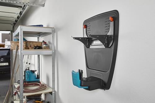 Mit der GARDENA Wandhalterung kann er dann besonders platzsparend, trocken und frostfrei in der Garage oder dem Keller aufbewahrt werden, Die robuste Halterung aus Metall bietet nicht nur Platz für das Gerät selbst, sondern auch für die Ladestation,