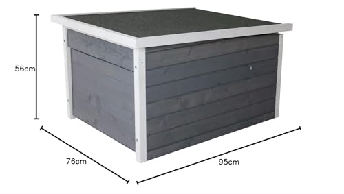 Rasenmäher-Garage für gängige Rasenroboter, Bausatz, aus Holz, fertig lasiert in grau mit weiß, wetterfest beschichtetes Dach, aufklappbar, Frontklappe, schließt bei geparktem Rasenmäher, Haus ca. L 95 x B 76 x H 56,5 cm